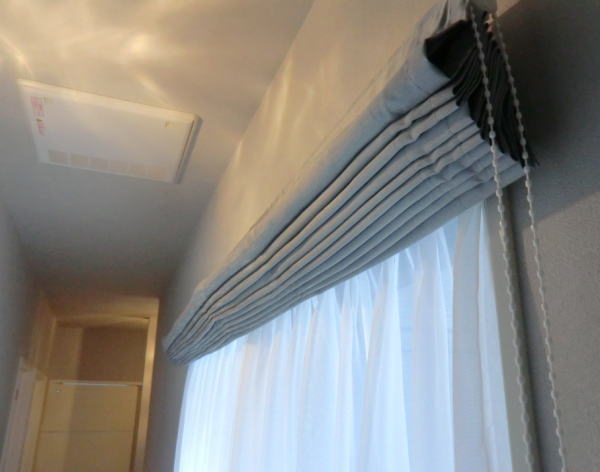 南面に面した窓より夏季を中心に日中陽射しが入るため光を遮るUV(紫外線カット機能付き)レースカーテン生地をプレーンシェードで仕立てました。肝は、UV機能レースカーテンです。